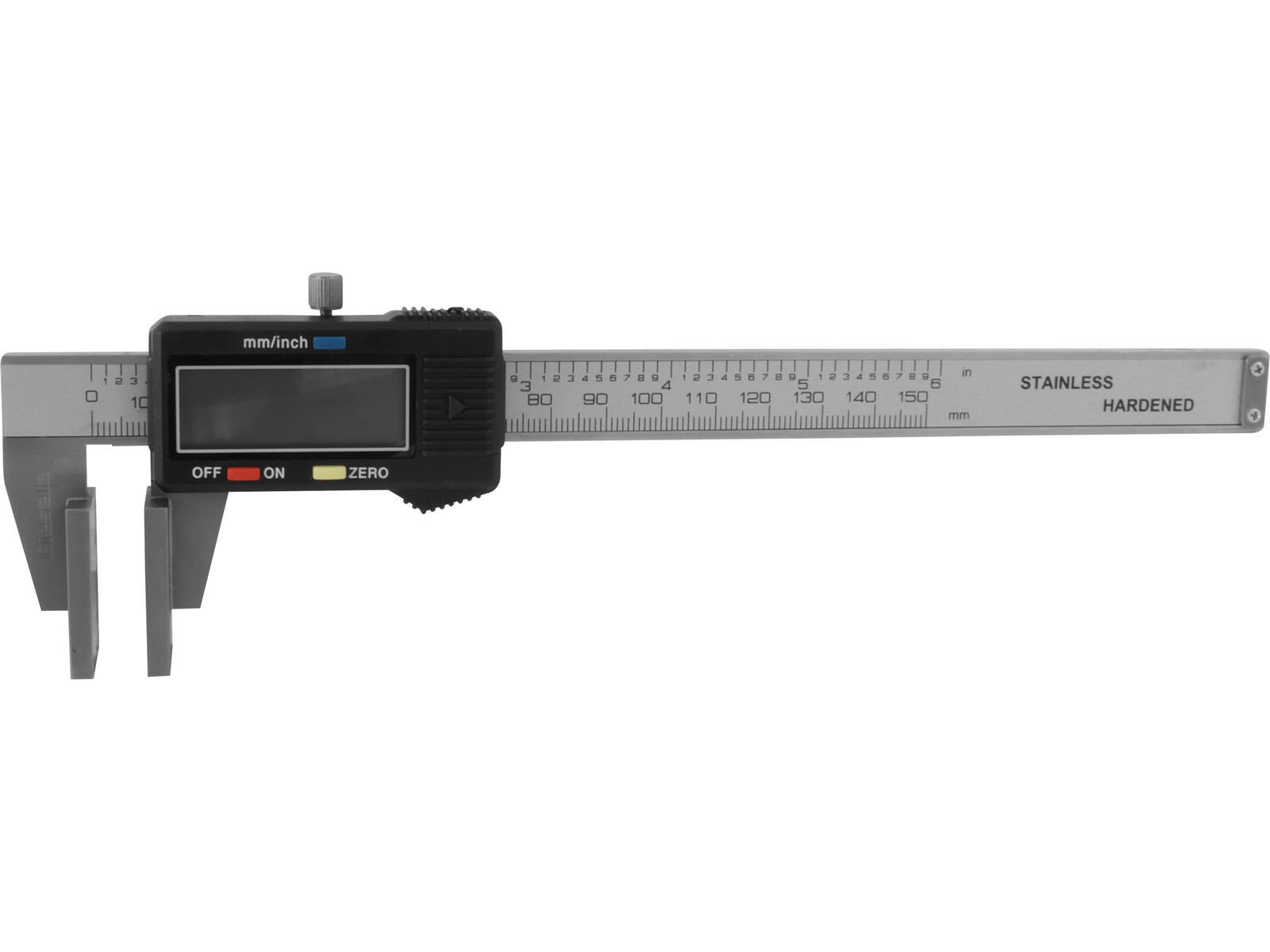 Measures from 0-200 mm with 0.01 mm reading and jaw length of 50 mm. Manual on/off, reset, switch mm/inch.