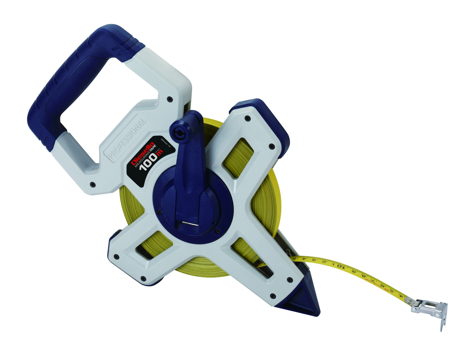 Heavy duty Open Reel Tape Measure with nylon coated tape, which makes the measuring tape extra durable. With yellow measuring tape, black mm-scale and red numbers for every 1 meter.