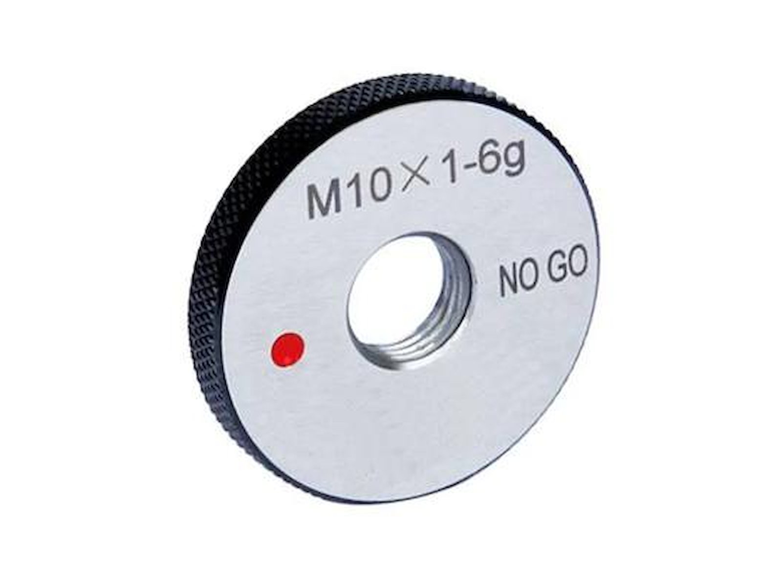 A thread ring gage is used to check acceptance and the pitch diameter of an external thread on a workpiece, and is available as a GO-ring gauge or NOGO-ring gauge. The NOGO gauge is marked with a red cirkel.