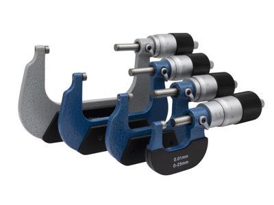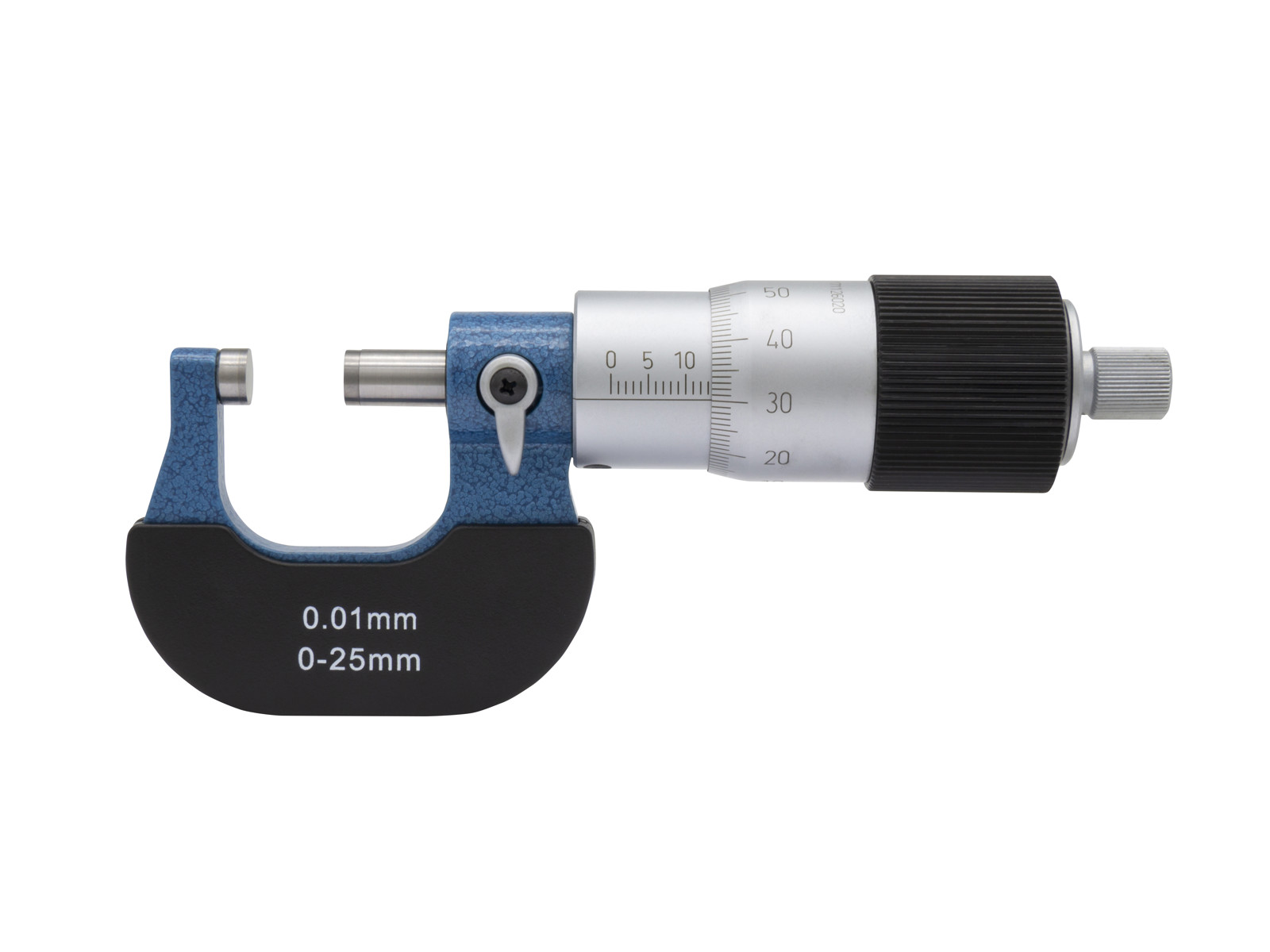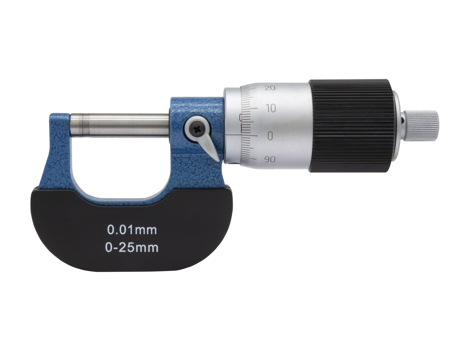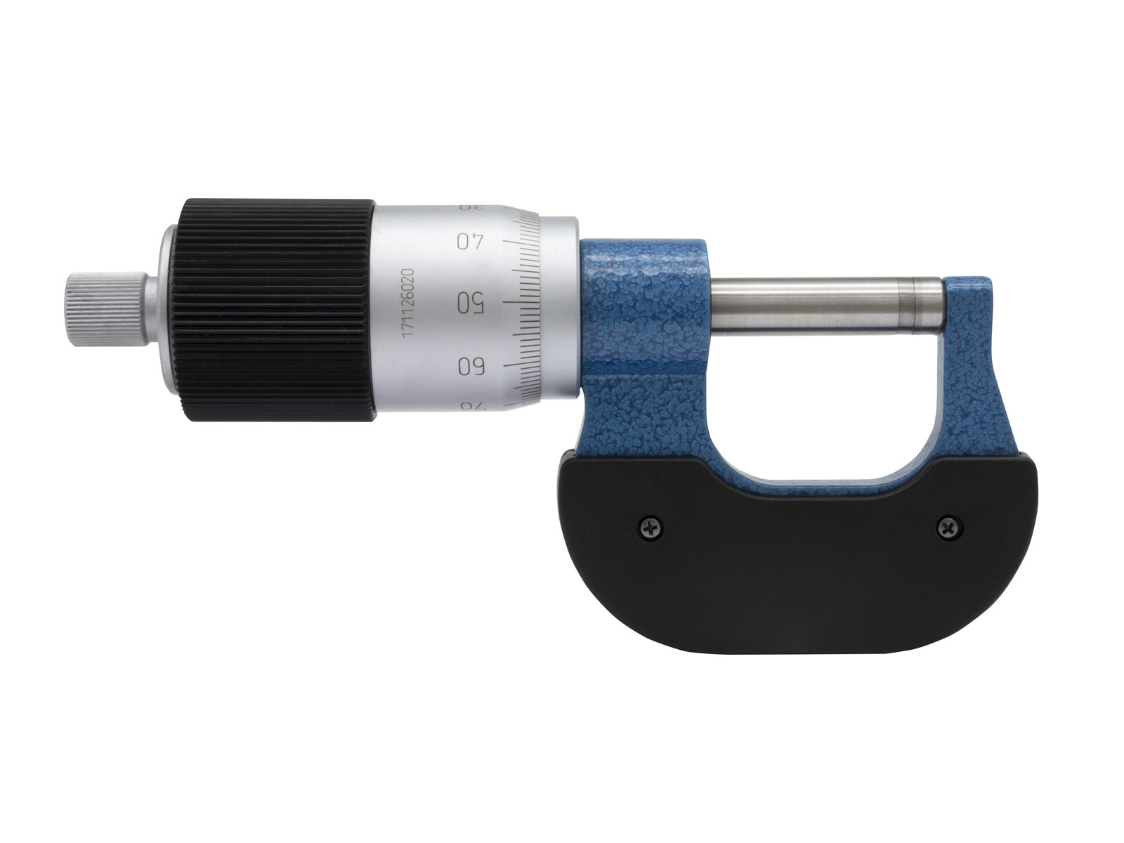 Outside micrometer with big thimble in chrome finish with 1/100 mm graduation. Precision lapped and with carbide-tipped measuring faces.