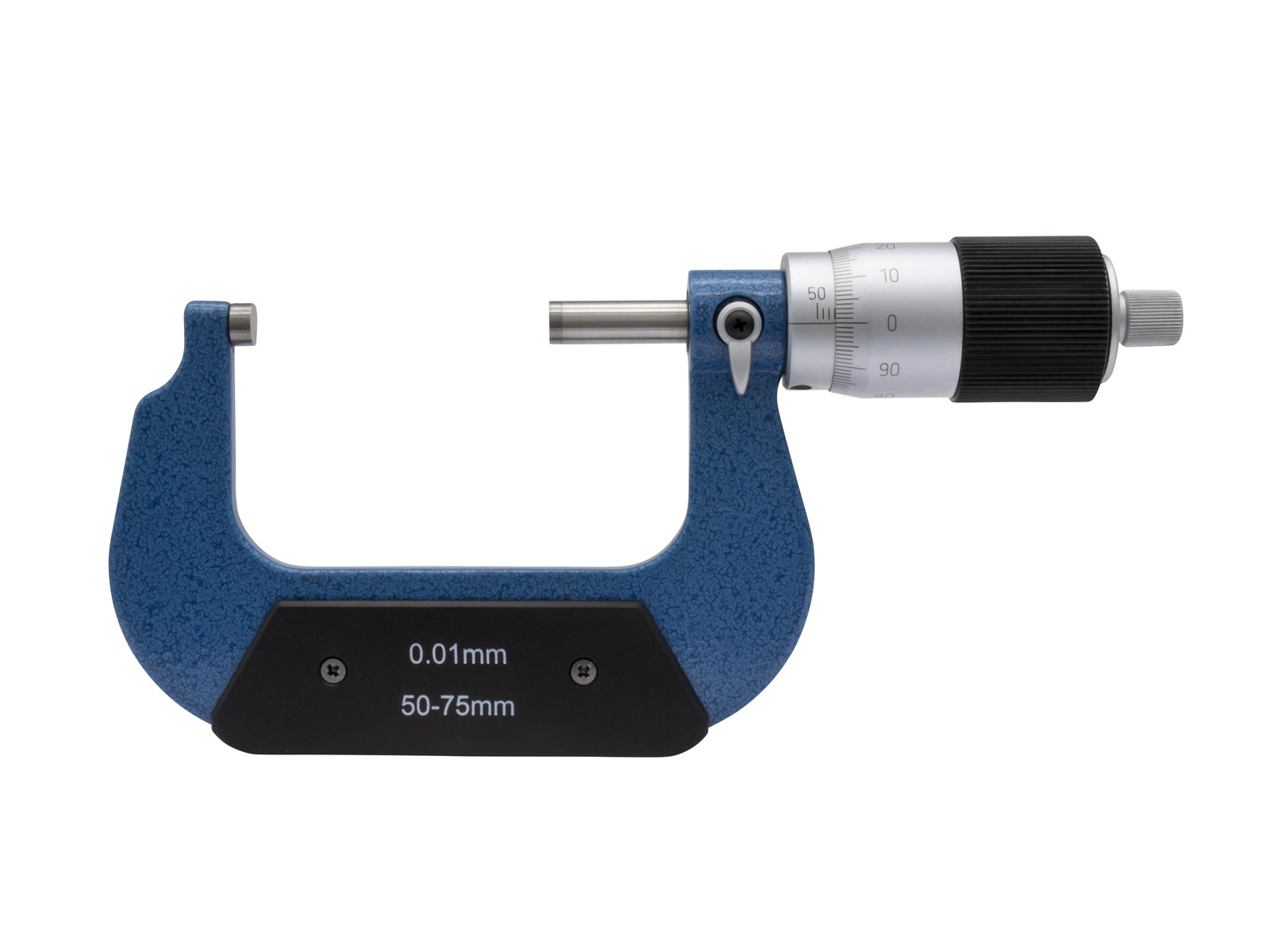 Outside micrometer with big thimble in chrome finish with 1/100 mm graduation. Precision lapped and with carbide-tipped measuring faces.