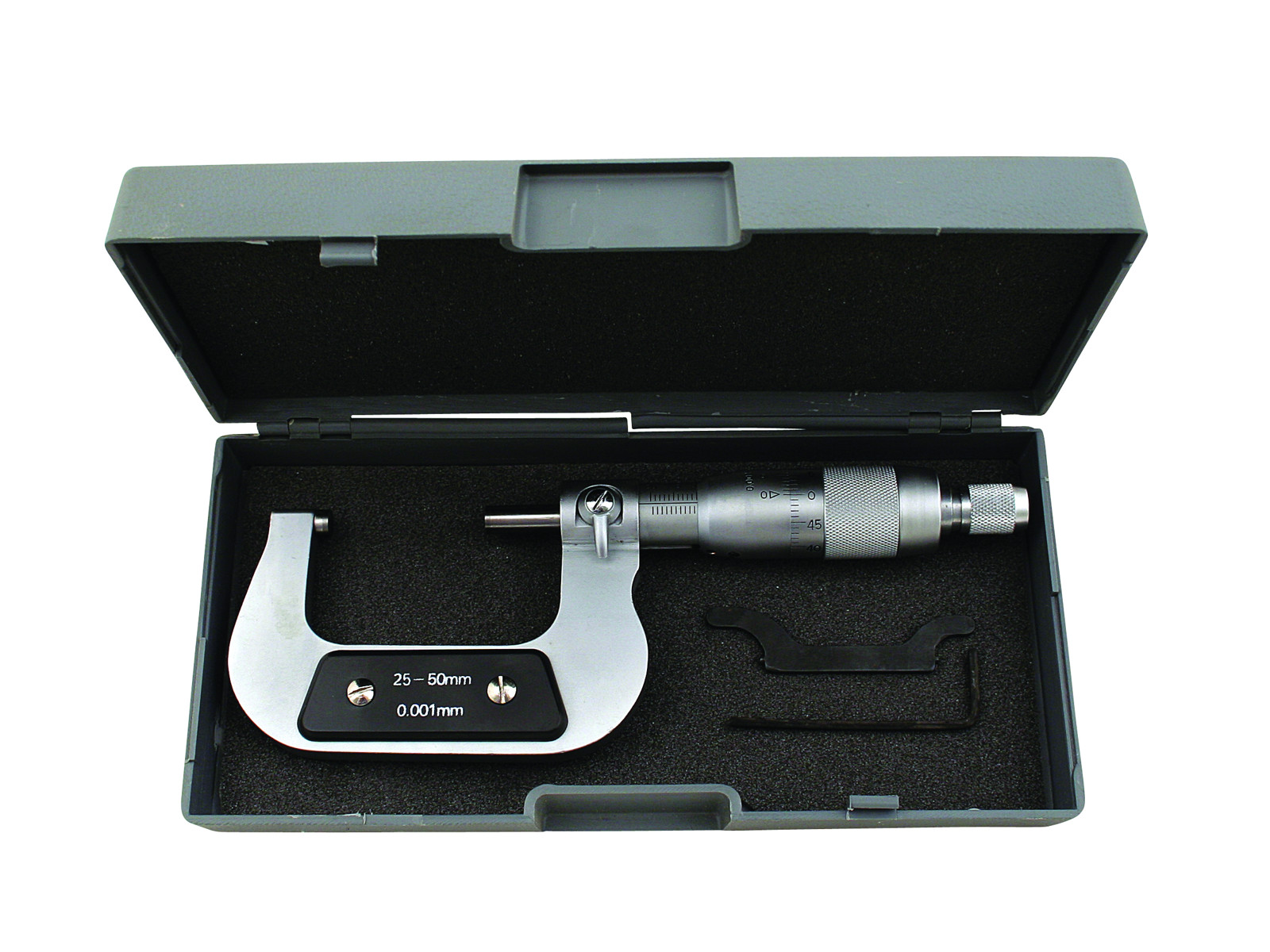 Matt chrome-plated and with tungsten carbide measuring surfaces and lacquered Forged frame. Inspection standards included - the smallest is 25 mm. DIN 863. Reading: 0.001 mm.