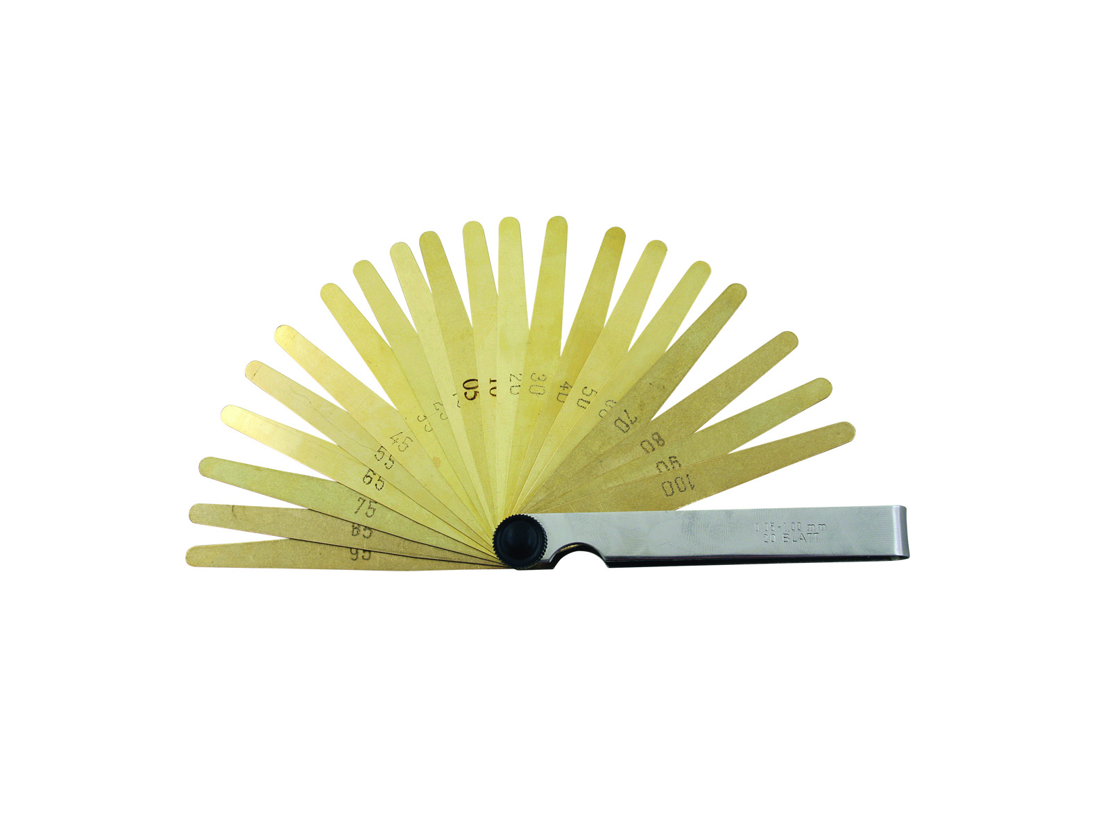 Non-magnetic feeler gauge in brass. 20 blades in thickness 0.05 - 1.00 mm: 0.05 - 0.10 - 0.15 - 0.20 - 0.25 - 0.30 - 0.35 - 0.40 - 0.45 - 0.50 0.55 - 0.60 - 0.65 - 0.70 - 0.75 - 0.80 - 0.85 - 0.90 - 0.95 - 1.0. This part number has previously been sold under art. 10585110.