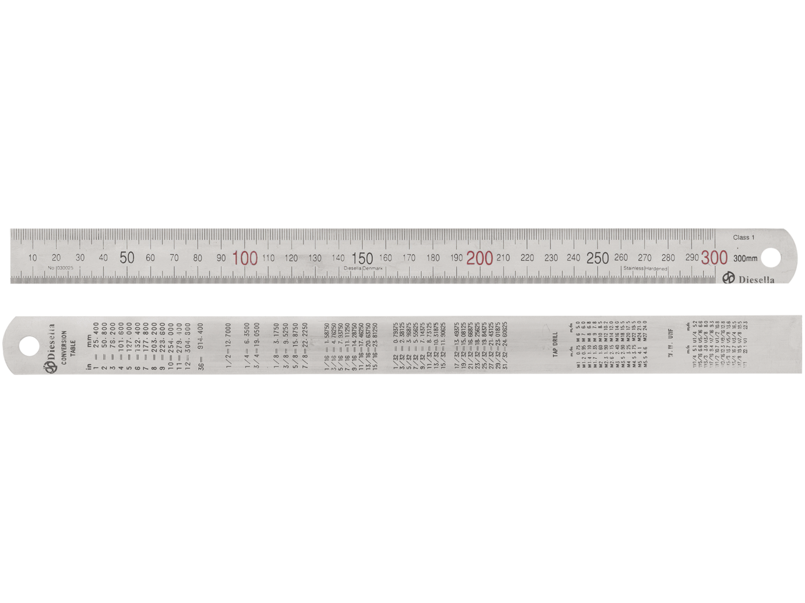 Metric. Stainless steel ruler. With matt chromed non-glare surface. • Division: 1 mm and 0,5 mm, thread-/ conversion table from inches to mm on the back. • Tolerance: EC class II.