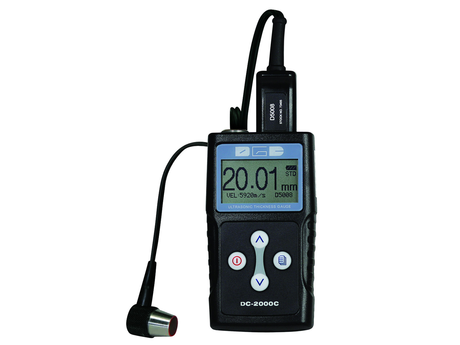 The wall thickness can be displayed with a resolution of 0.01 mm / 0.001 ”or 0.1 mm / 0.01”. Model 15 081 425 has a large backlit multi LCD display that shows measured value, battery status, probe selection, sound speed and storage / memory space.