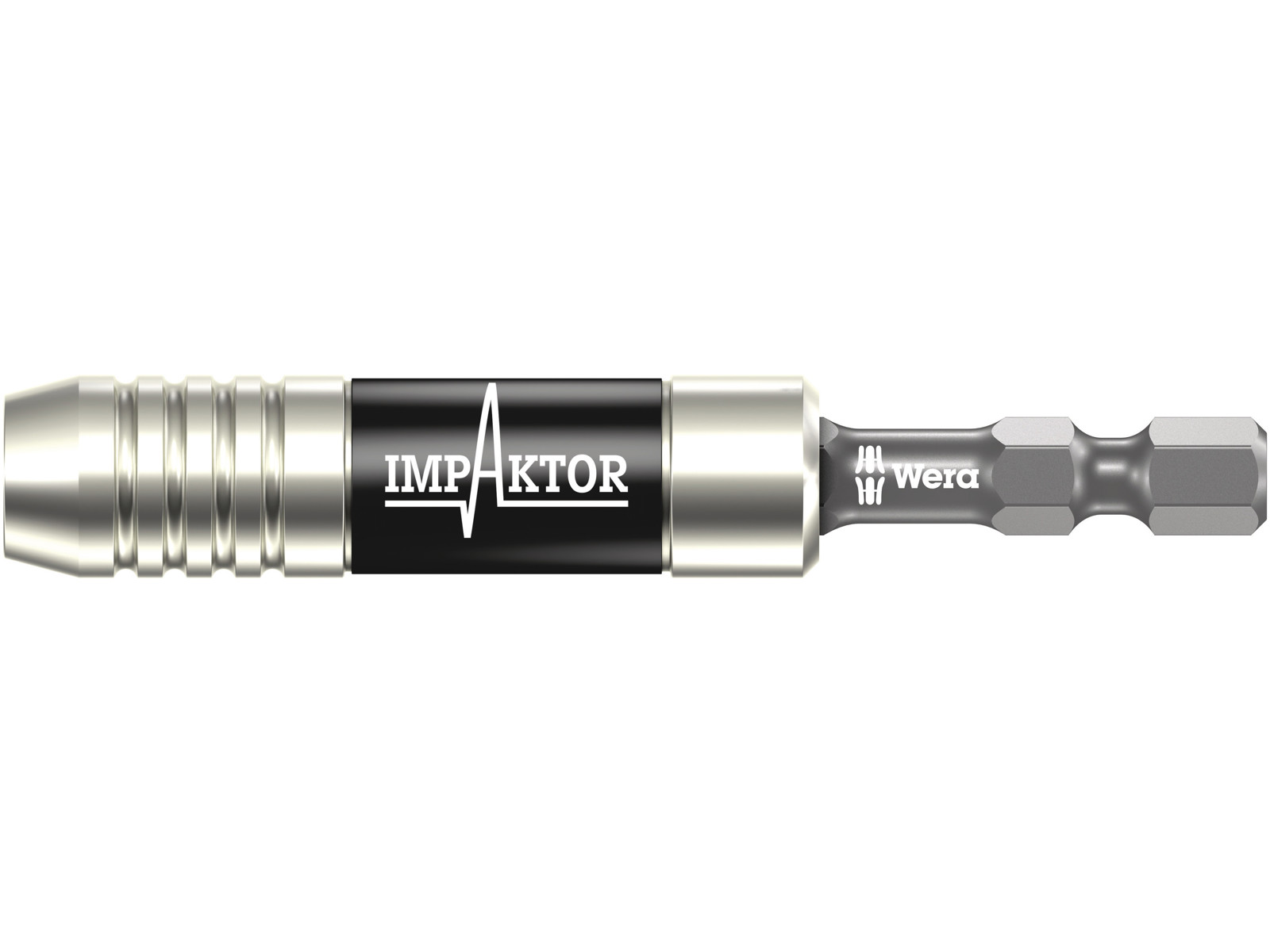 Wera Impaktor holder for the absorption of impulse peaks. Particular torsion effect thanks to the double-torsion spring. The retaining ring ensures an optimum fit of the tool in the holder. The magnet provides for additional fixing of the bit and screw. The Impaktor stainless holder with retaining ring and magnet meets the extremely dynamic demands by doing without any small, mechanical parts that are often susceptible. Used mostly for industrial assembly applications such as e.g. with screwdriving robots. Output: suitable for bits with ¼" hexagon head drive as per DIN ISO 1173-C 6.3. Drive: 1/4" hexagon, suitable for power screwdrivers with take-up as per DIN ISO 1173-F 6.3.