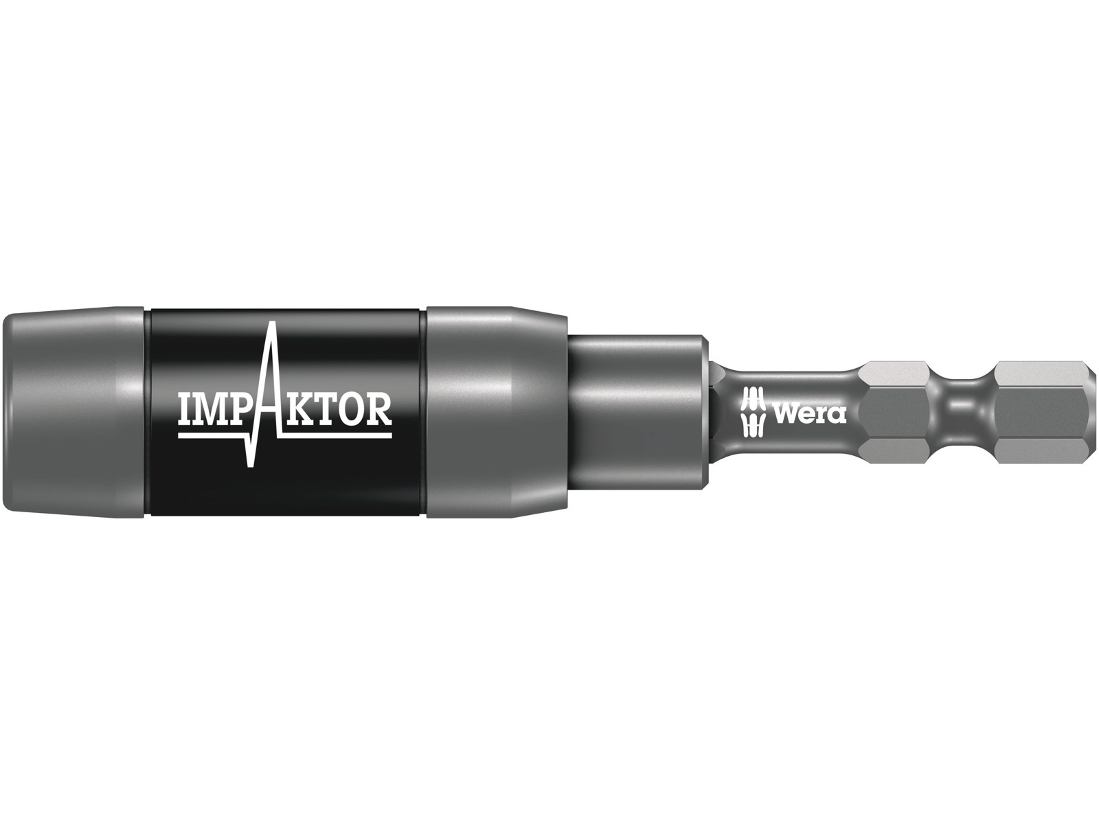 Wera Impaktor holder for the absorption of extreme impulse peaks. Special torsion effect thanks to the double-torsion spring. The Impaktor holder additionally holds long and heavy screws absolutely securely. This enables a rapid and dependable positioning of the screw. Ideal also for overhead work. Should, situation-related, the magnet not be desired e.g. when working with metal, it can be removed from the screwdriving zone and thereby be neutralised. Used mostly for manual power tool applications. Output: suitable for bits with ¼" hexagon head drive as per DIN ISO 1173-C 6.3. Drive: ¼" hexagon, suitable for power screwdrivers with take-up as per DIN ISO 1173-F 6.3.