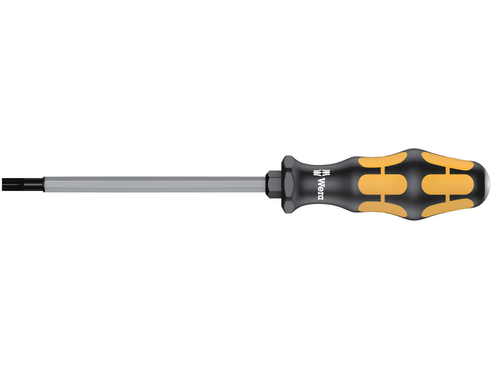 • Wera Chiseldriver for fastening, chiselling and loosening seized screws. Multi-component Kraftform handle for fast and low-fatigue working. A hexagon blade out of high quality bit material that extends right through the blade ensures full transfer of force, even when struck with a hammer. Ductile tempered material to prevent the blade from splintering or breaking. Comes with an impact cap for durability and reduced risk of splintering. More torque can be transferred with the help of an open-end or ring spanner applied to the integrated hexagonal bolster. The Wera Black Point tip and a complex hardening process ensure a long service life of the tip, enhanced corrosion protection and an exact fit. The hexagonal anti-roll feature prevents any bothersome rolling away at the workplace.
