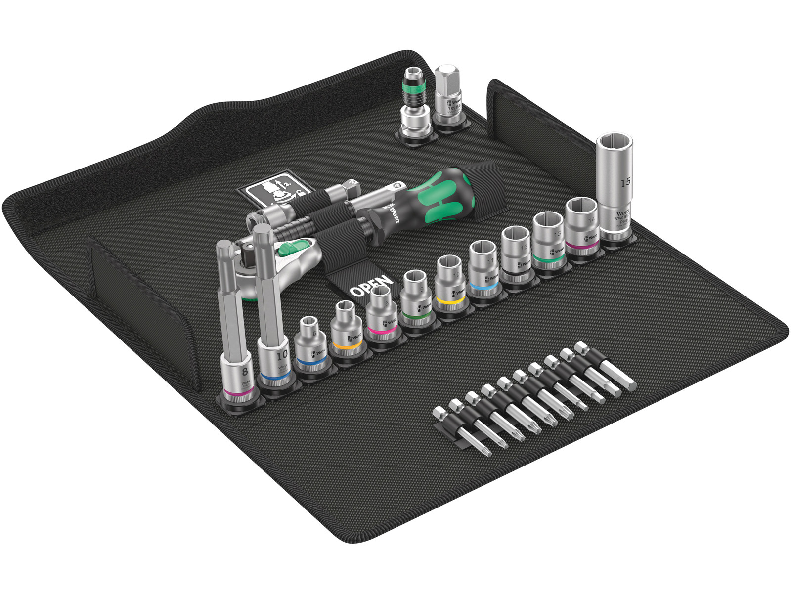 27-piece 3/8" ratchet set for typical bicycle operations with extensive accessories: 1 Zyklop Speed ratchet with 3/8" drive, 10 Zyklop sockets, 2 Zyklop bit sockets with 30 mm and extra slim profile area for better accessibility in tight workspaces. With Take it easy tool finder: Colour coding by size. 1 Zyklop extension (short) with fast-rotating sleeve, 1 "Wobble" extension, 1 bit adapter, 1 connection part 3/8" external square head to 1/2" external square head, 10 bits, tough, for universal use. Incredibly compact set arrangement for many tools in a tight space thanks to the highly robust and durable textile box. Can be placed in an upright position for clearly arranged storage in the workshop shelf. Additional surface protection due to textile outer material. Low weight and small size for better mobility.