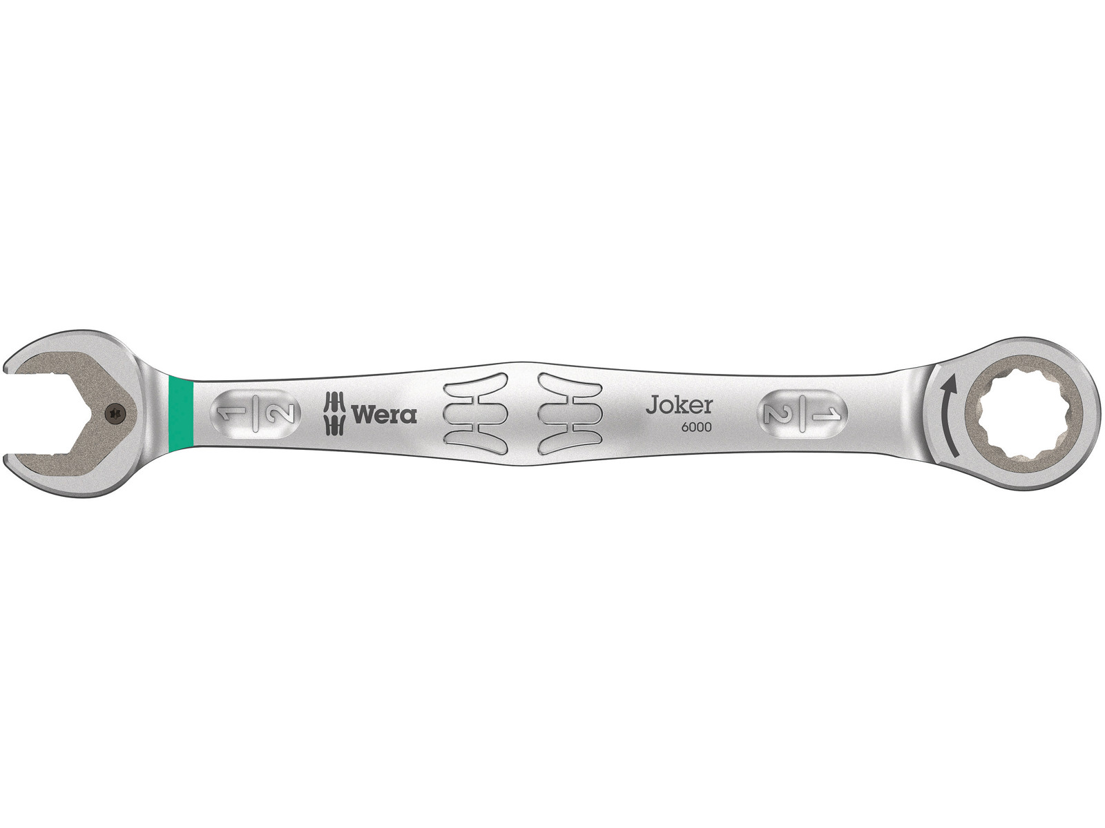 • High quality, imperial, combination ratchet wrench by Wera. Everything that a wrench has to be able to do. And a whole lot more. Faster, better, stylish. Yes, a real Joker. The new generation of combination ratchet wrenches. Suitable for hexagon socket screws, bolts or nuts. Comes with holding function, thanks to the metal plate in the jaw, which reduces the risk of dropping nuts and bolts. The replaceable metal plate in the jaw secures nuts and bolts with its extra hard teeth and reduces the danger of slipping. The integrated limit stop prevents any slipping around the bolt head and allows higher torque to be applied. The double-hex geometry makes for a positive connection with nuts or bolts and reduces the risk of slipping. A return angle of only 30° at the open end prevents any time consuming flipping of the wrench. The ratchet mechanism at the ring end, with an exceptional, fine-tooth mechanism - 80 teeth in all - enables flexibility even in very confined working spaces. The specially forged geometry ensures high torque transfer and strength. The ratchet is manufactured out of high performance chrome molybdenum steel with nickel-chrome coating for high corrosion protection. Take it easy Tool Finder with colour coding according to sizes.